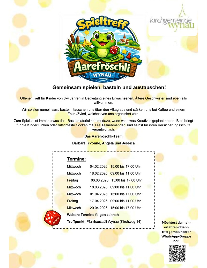 Zu den Angeboten für KLEIN und gross gehört auch das Aarefröschli-Treff. Ein Eltern-Kind-Treff, wo zusammen gespielt, gebastelt, gegessen, Kaffee getrunken und geplaudert wird.